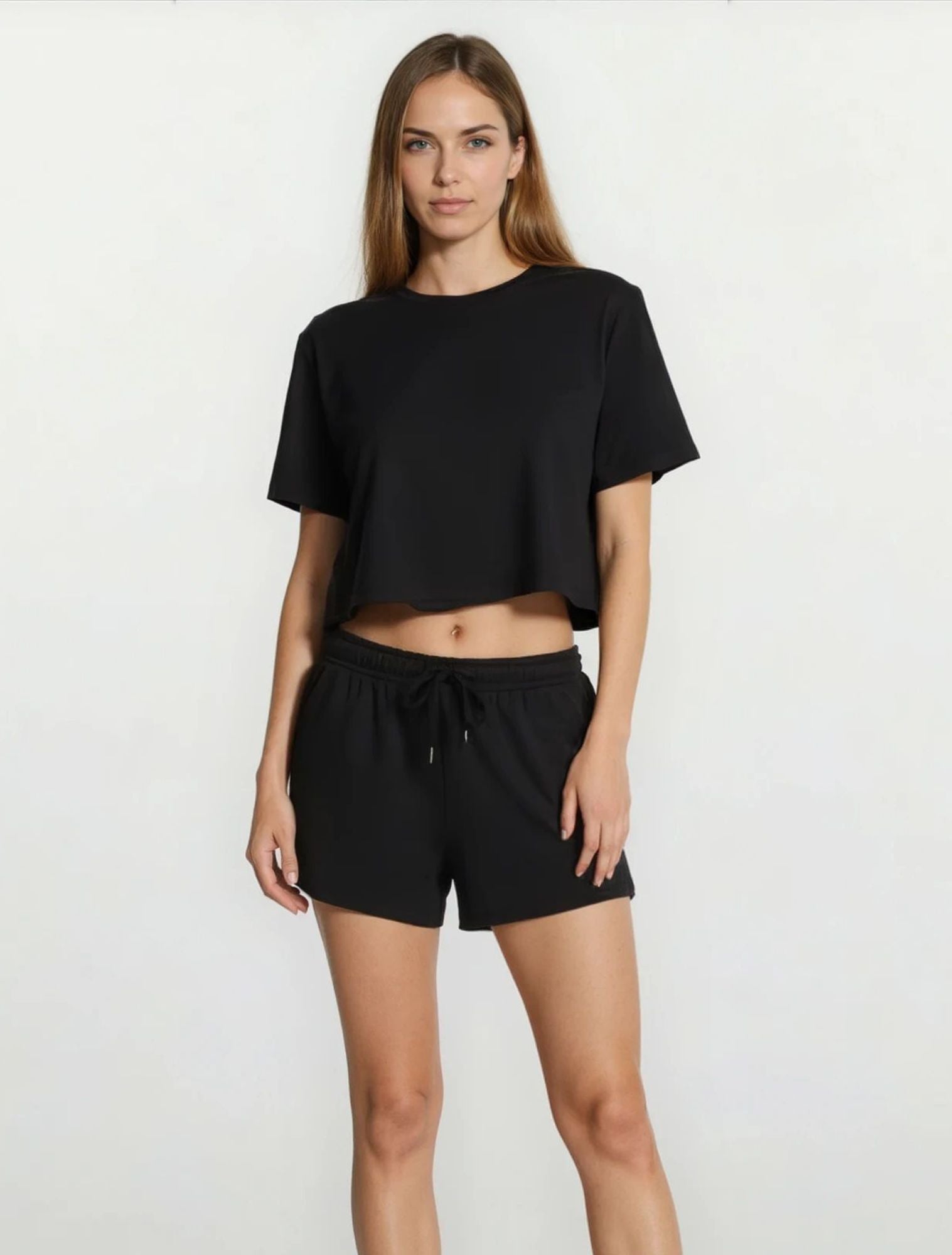 The soft neckline and crop fit of the tee alongside the gentle elastic waist, adjustable tie and relaxed fit of the shorts is the perfect blend of style and functionality to take you from home to the street in no time.